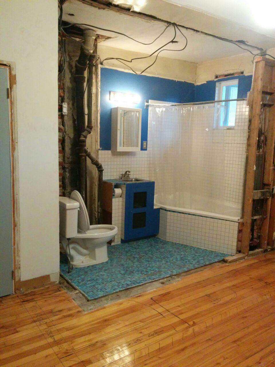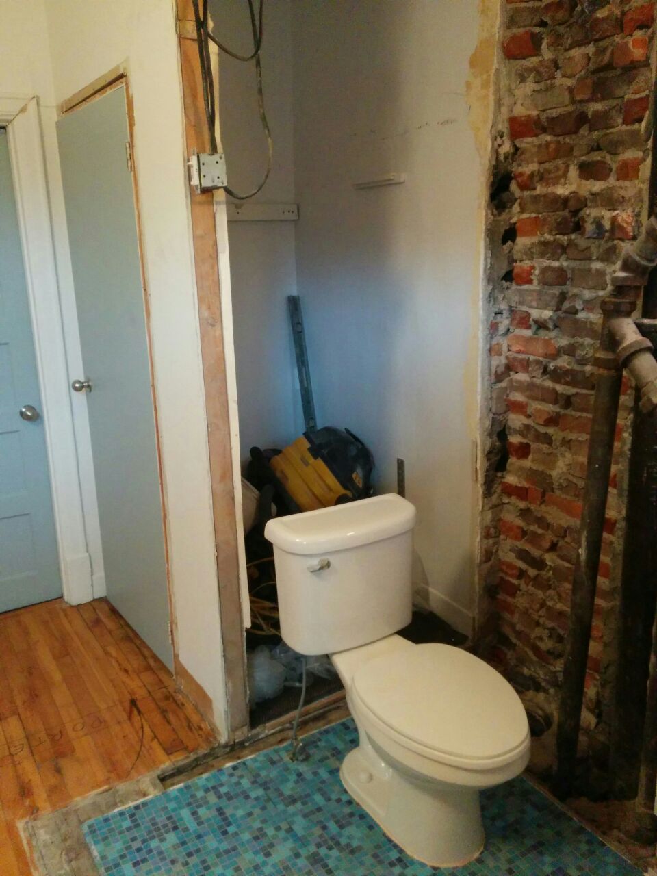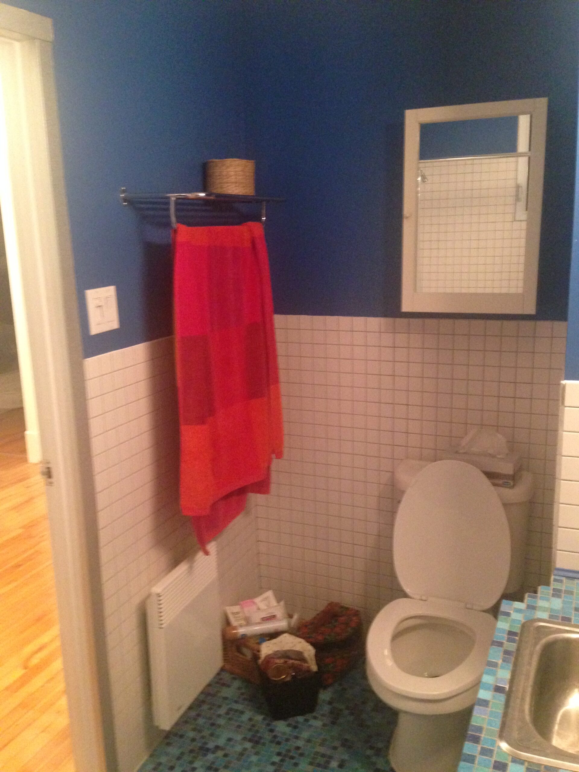 Rénovation, agencement et décoration de la salle de bain, d’un toilette séparé et de la chambre principale d’une maison de ville à Montréal.